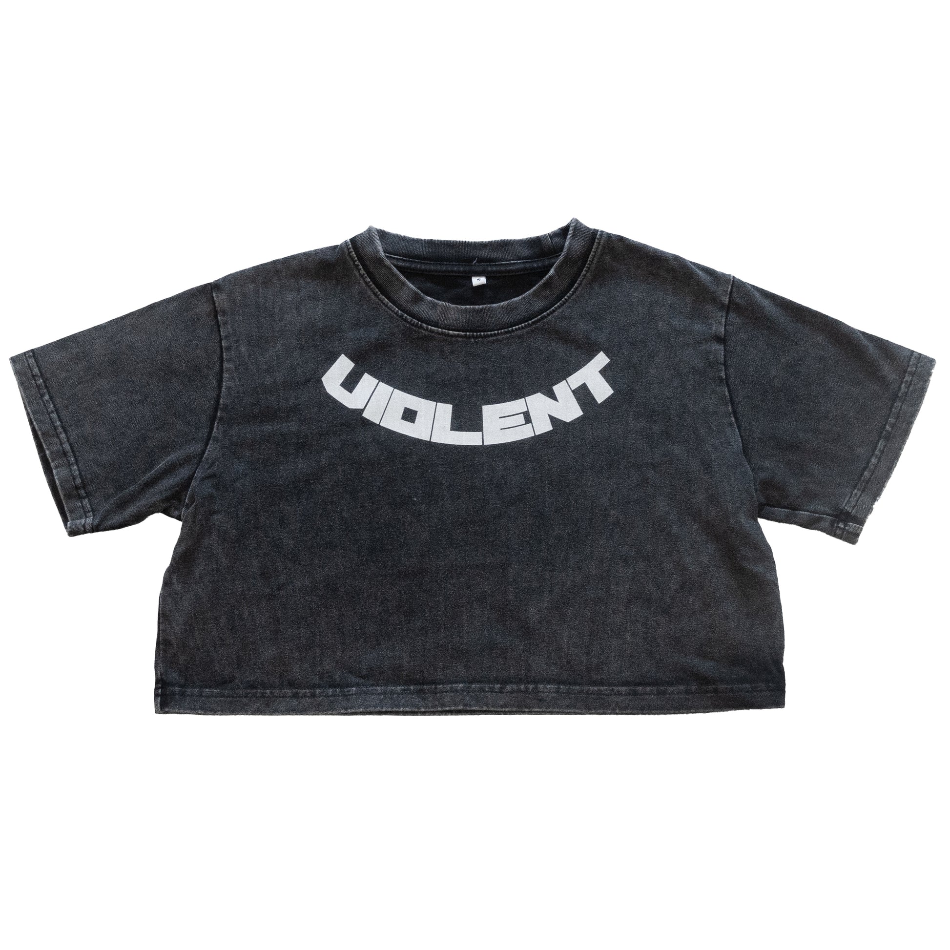 The Violent Priest crop tee is a medium weight acid wash mini crop, works great with a pencil skirt or cargo pants depending on the vibe.